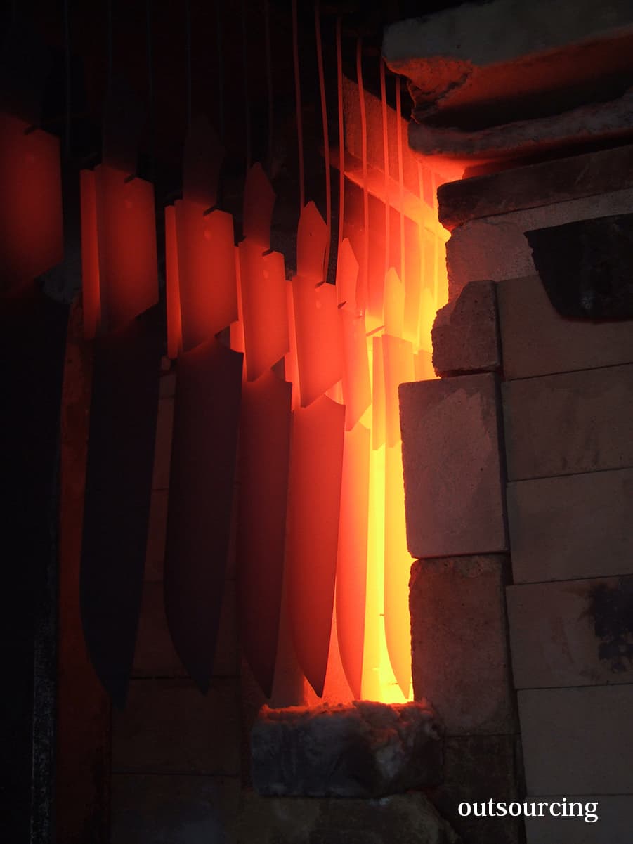 熱処理は、包丁の形に抜き取られた鋼材の硬度・強度・靱性・耐摩耗性を上げるための工程です。先ず1000℃を超える高温で加熱し金属組織を変態させ硬度・強度を上げます。続けてマイナス75℃で冷却(サブゼロ処理)することで、時を経て歪み・変形の原因となる残留組織の問題を解消。その後、150℃×2回の焼戻しで、靱性、耐摩耗性を持たせます。