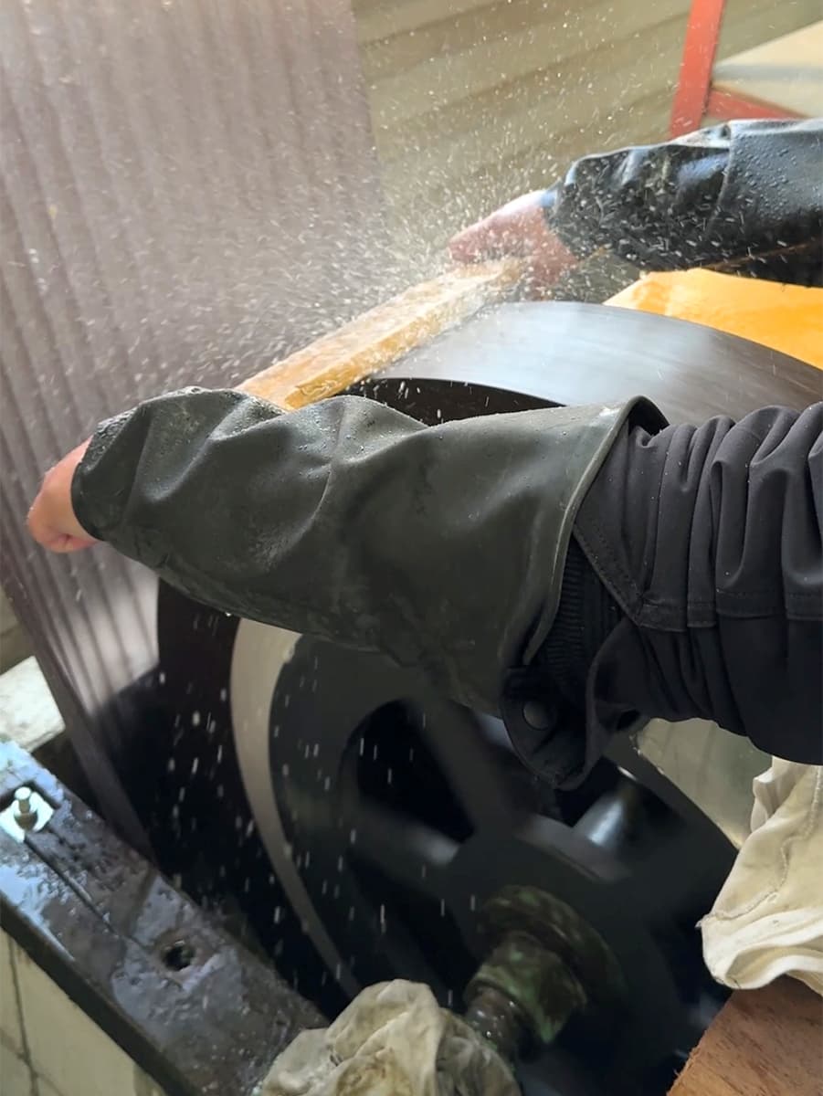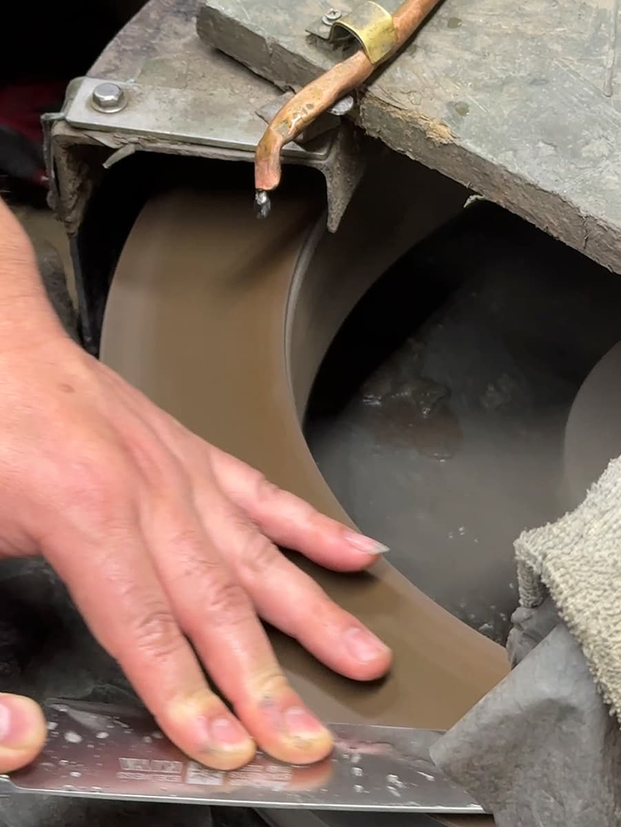 画像の水砥作業では、研削機の直線的な研削に熟練工が緩やかなカーブを付けています。この工程により食材への食い込みが良くなり、ブレードへの張り付きを防ぐ効果も上がります。