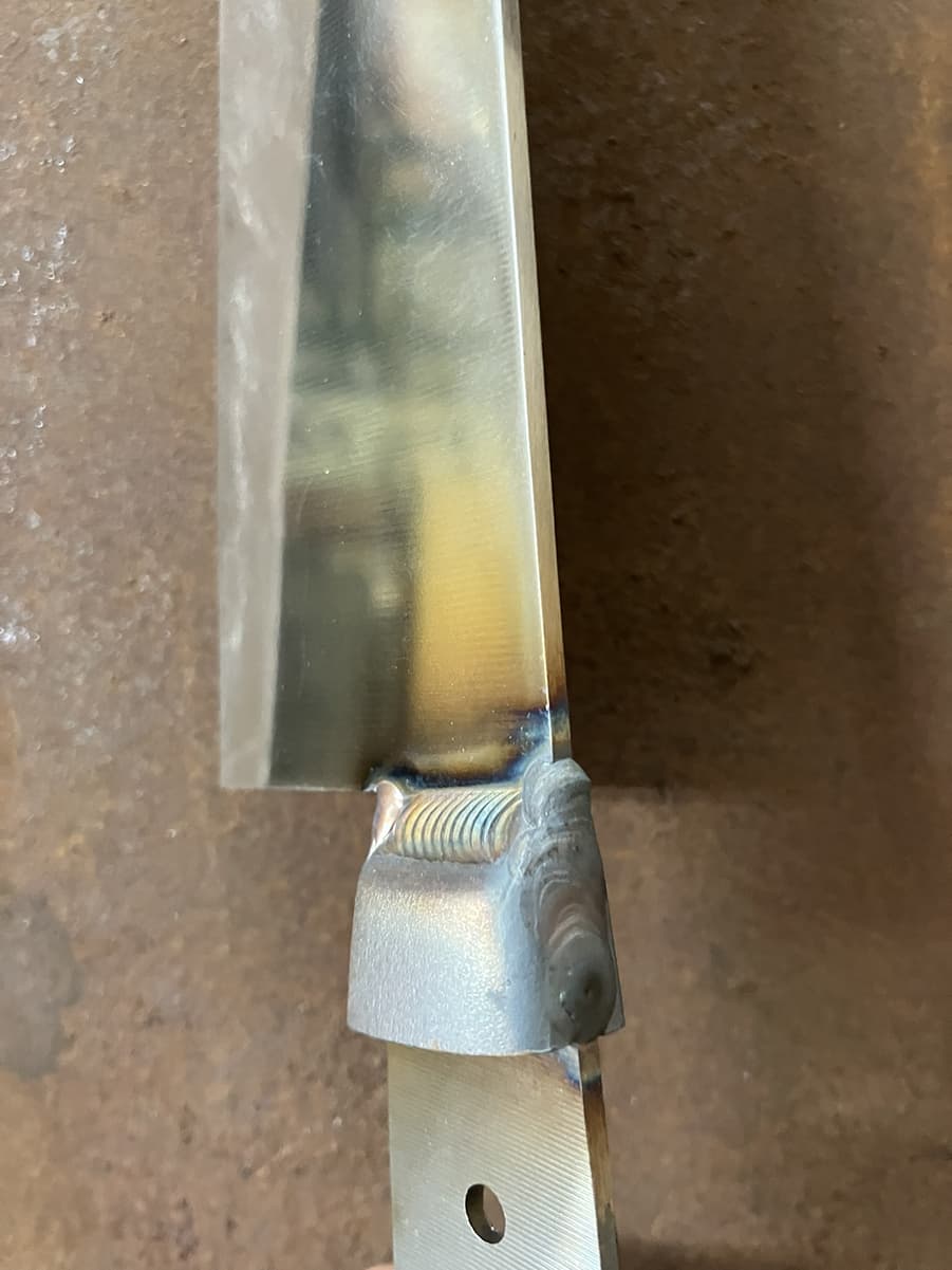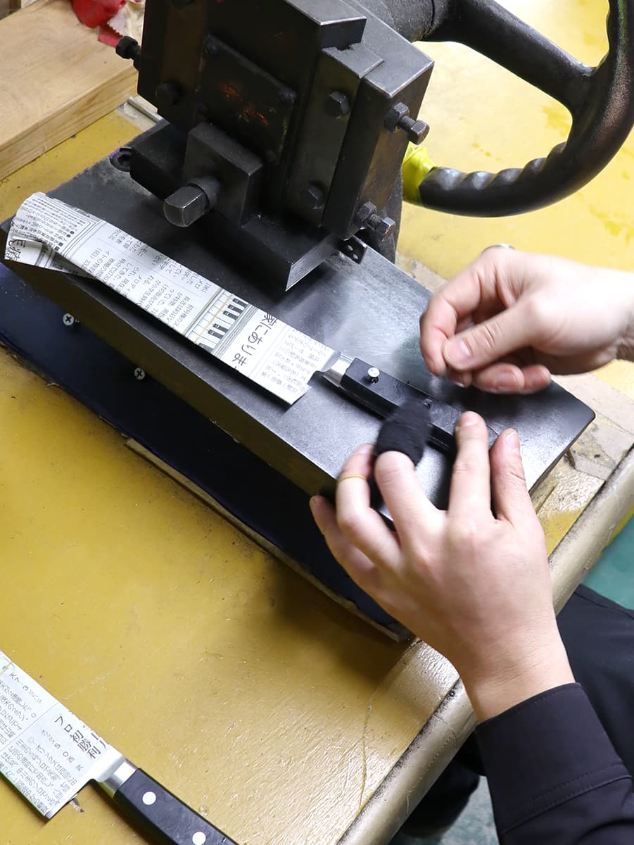 高温に熱した金属を型に入れプレス・成形された口金を、両側から包丁を挟み込むように溶接します。エーデルワイス包丁発売当初は不可能だったステンレス包丁への口金溶接は、長年の研究改良により可能となった工程です。
