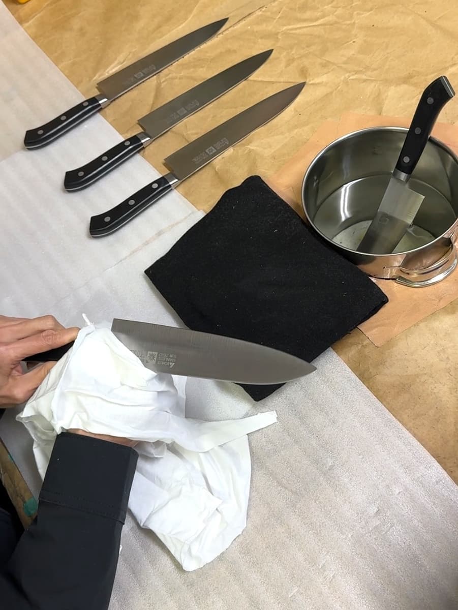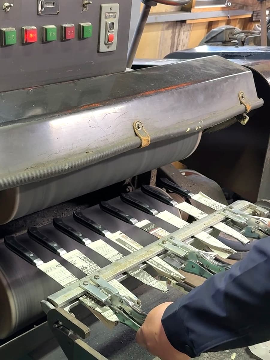 ブレードに一定方向の目を入れ、細かい傷を整えます。熱の影響を受けないよう水を掛けながらの作業になります。