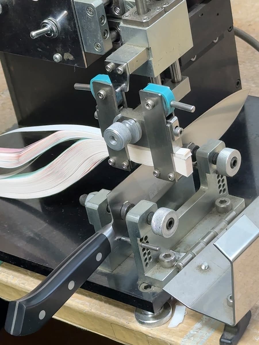 完成した包丁は切れ味試験機でチェックされ製品になります。